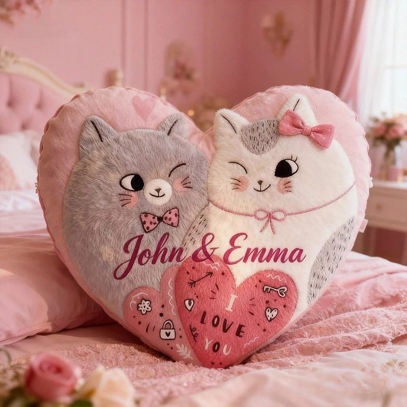 Personalized Couple Cats Heart Pillow with Name Custom Couple Valentine's Day Gift
