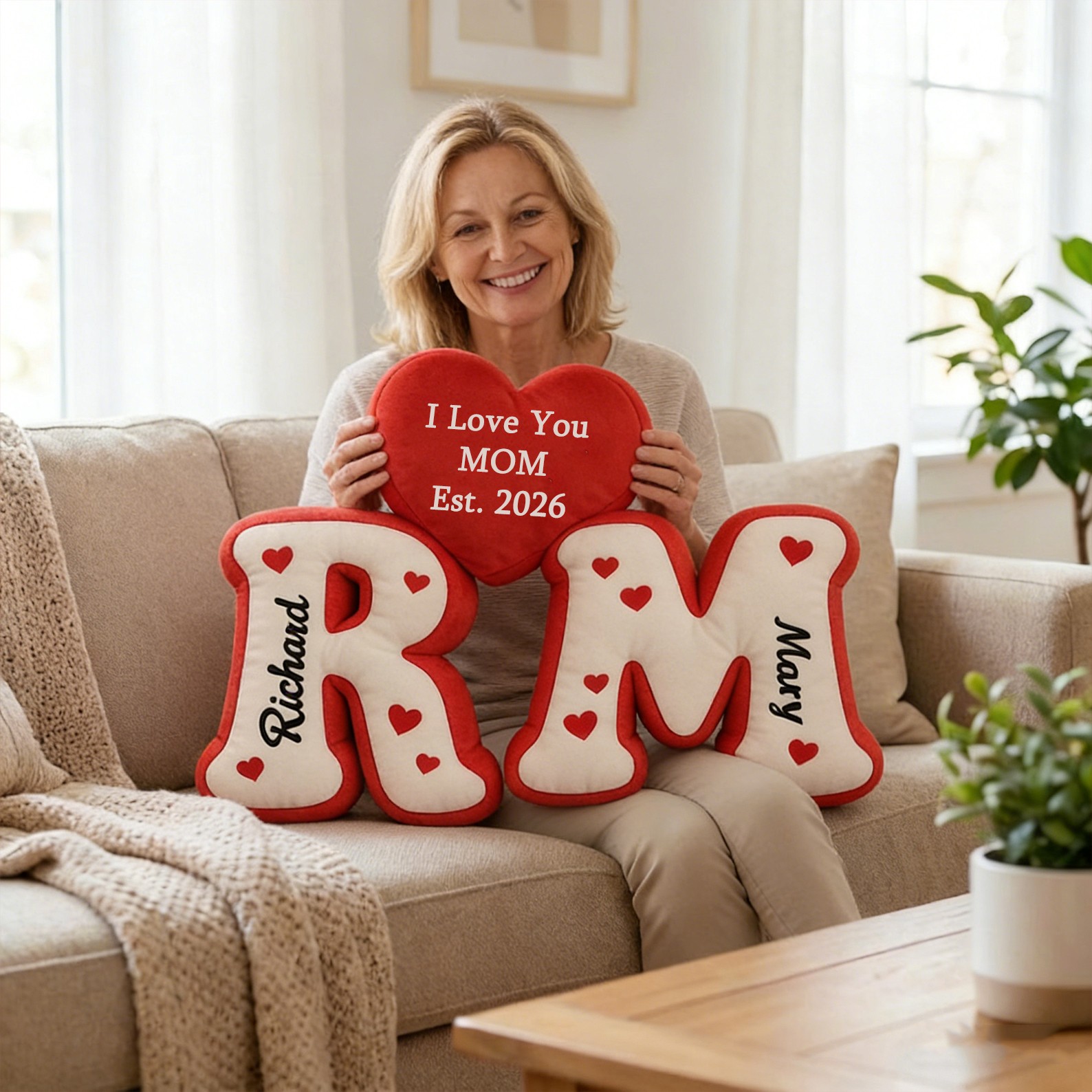 Personalized Mom Initial Pillow with Heart Custom Name Plush Pillow Unique Mother's Day Gift for Mom, Grandma & Family